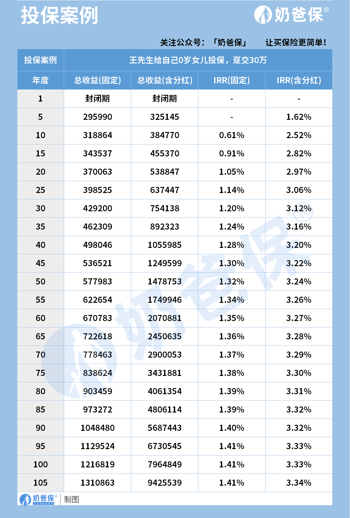 投保第10年被保人年满50岁,固定部分总利益接近50万,含分红收益超过57万,含分红内部收益率达到1.85%,资金实现稳健增值。