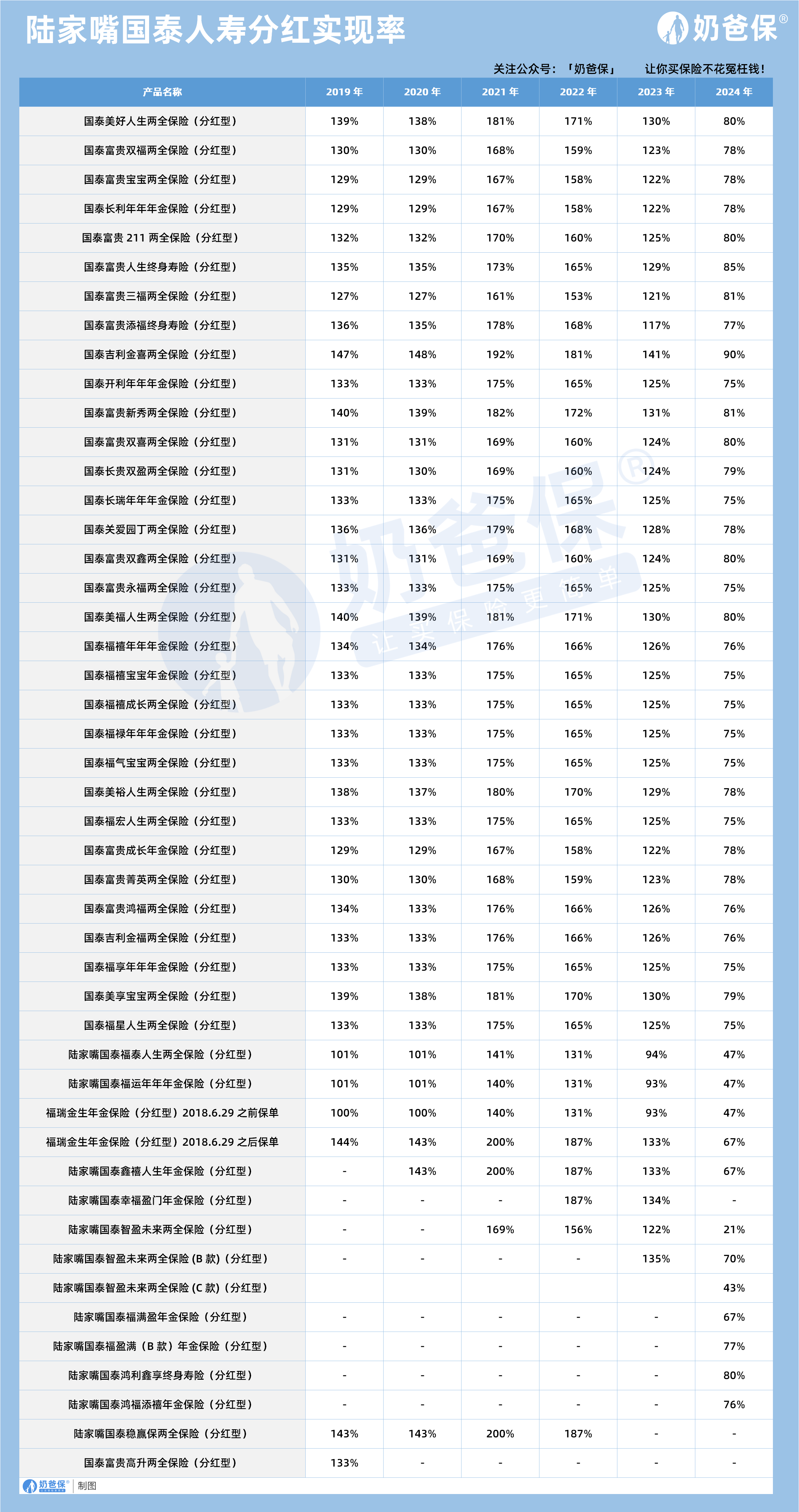 从陆家嘴国泰人寿过去几年的分红实现率数据来看,多数老牌分红险产品在前期的表现都相当亮眼,大部分产品在2019到2022年的分红实现率都超过了100%,不少产品甚至达到了170%以上,也就是说当时投保的用户,实际拿到的分红比演示的还要高,确实享受到了不错的收益。