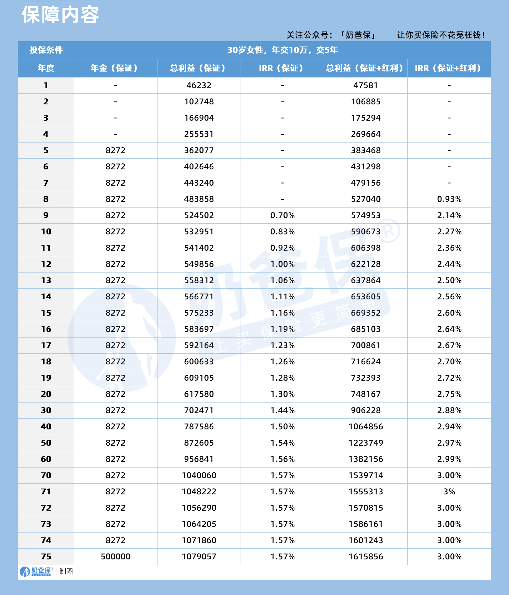 30岁女性,5年交,年交10万,叠加红利收益,