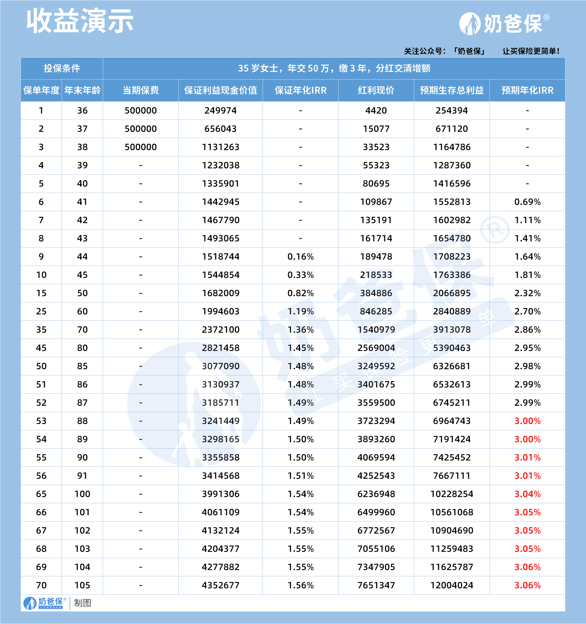 从收益表现来看,以35岁女性年交50万元交3年为例,