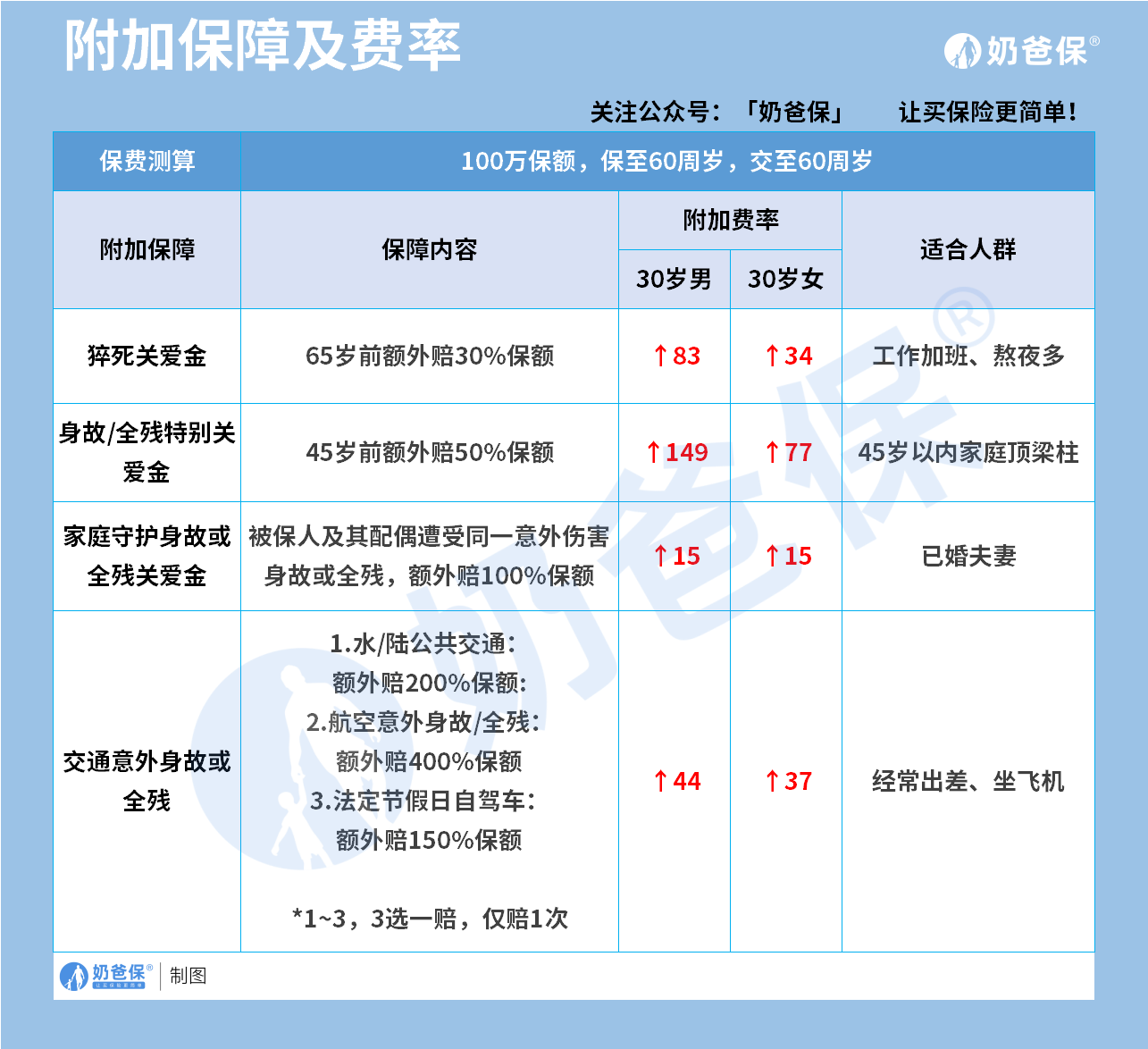 我们来看附加保障及其费率情况: