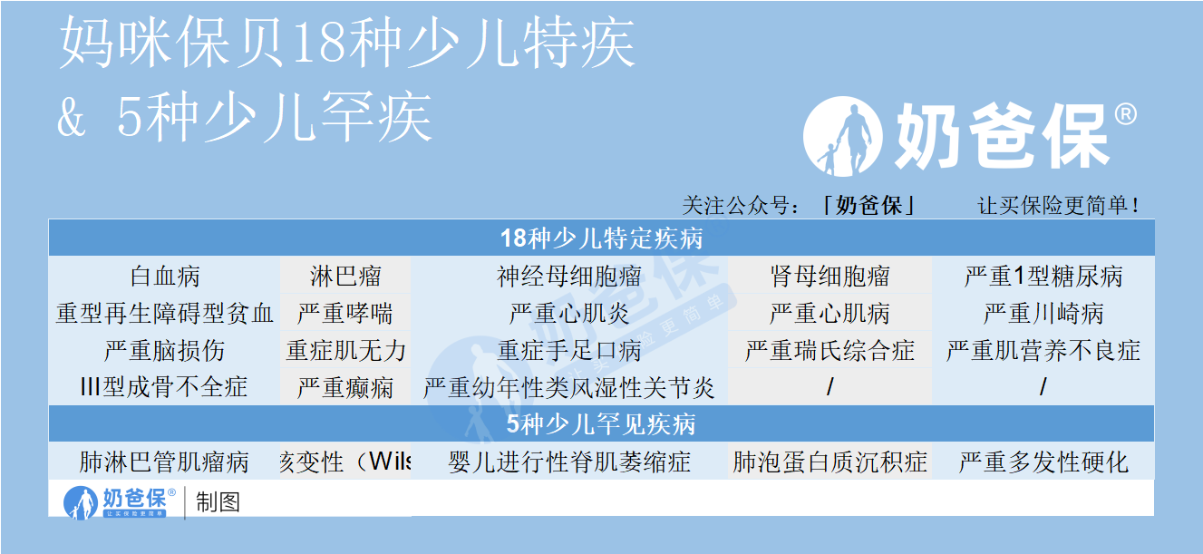 以妈咪保贝为例,它可以附加18种少儿特定疾病保障和5种少儿罕见疾病保障: