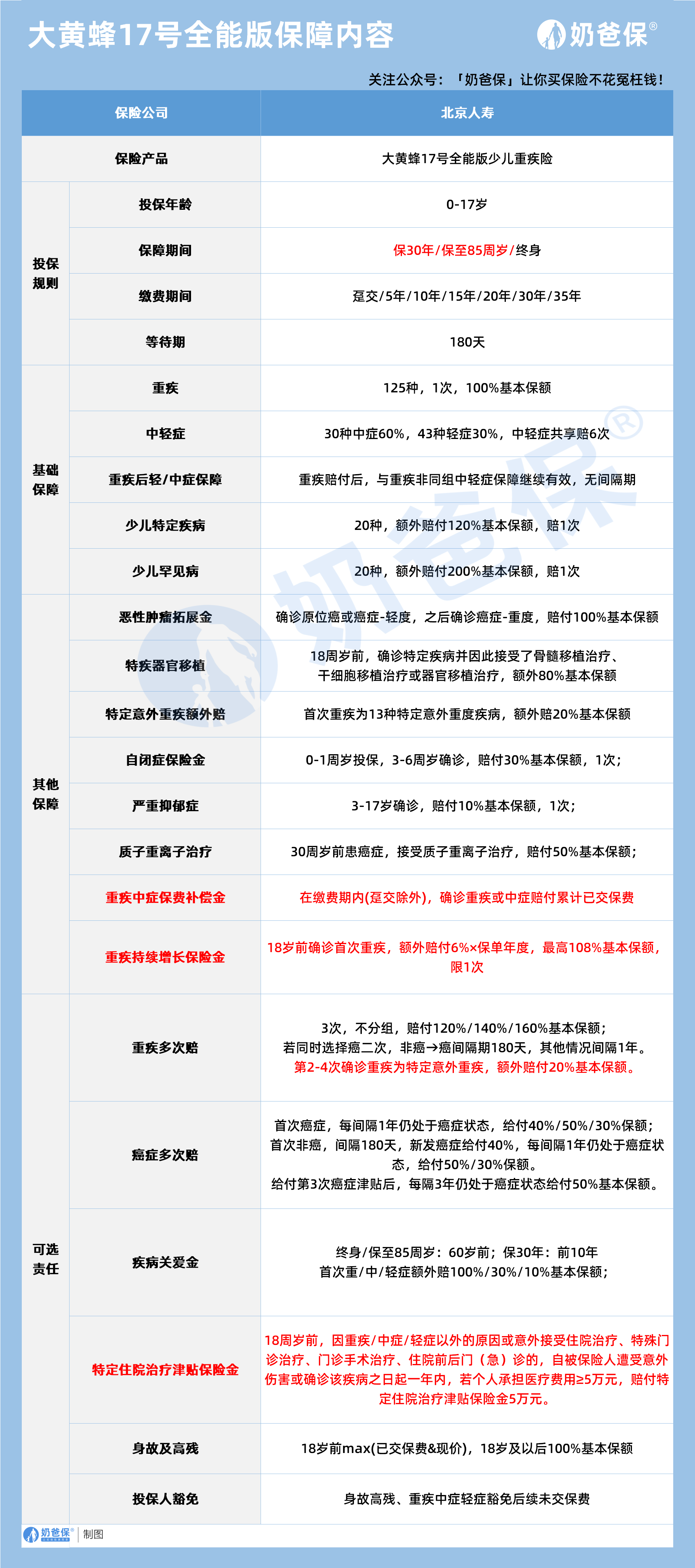 大黄蜂 17 号全能版是北京人寿推出的少儿重疾险,专为 0-17 岁孩子设计全面保障方案。